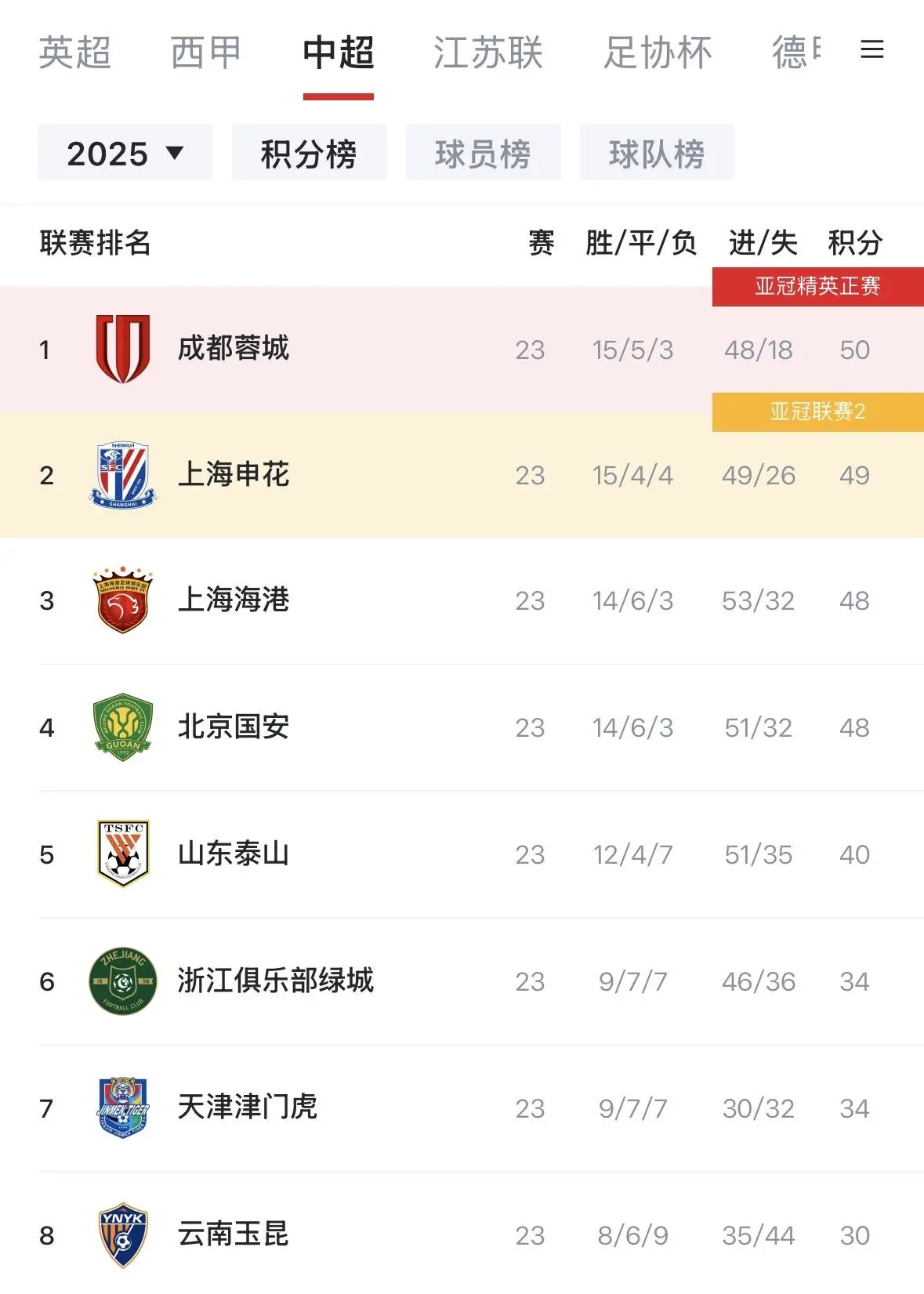 虎扑08月31日讯 中超联赛第23轮本周末战罢,在争冠直接对话中大胜海港的成都蓉城以1分优势登顶,而他们的对手国安、申花本轮均输球。