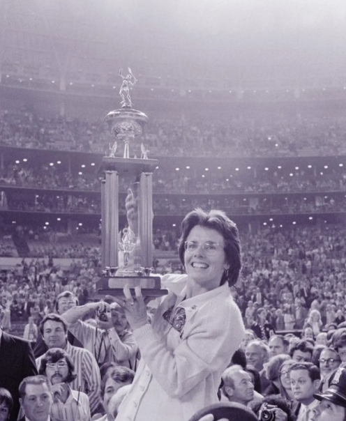 比如,我们去追溯历史,去看 1973 年的“性别之战”,比利·简·金对战鲍比·里格斯。在 3 万名现场观众和 1.4 亿全球电视观众的见证下,29 岁的比利战胜了男子温网冠军里格斯,赢得了历史性的胜利。